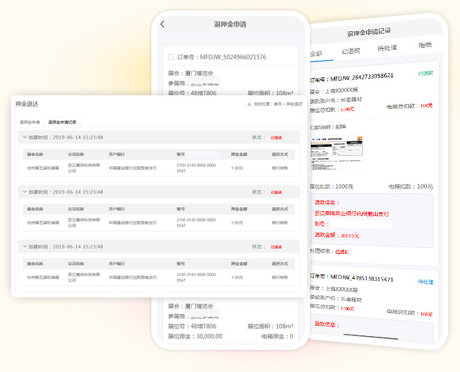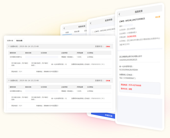 搭建商在线缴纳报馆费用后,可直接在系统中申请发票,同时查询发票进度信息,系统自动根据缴费记录生成发票申请,主场方审核通过后,即可完成发票开具流程,申请退押金也是一样的操作。